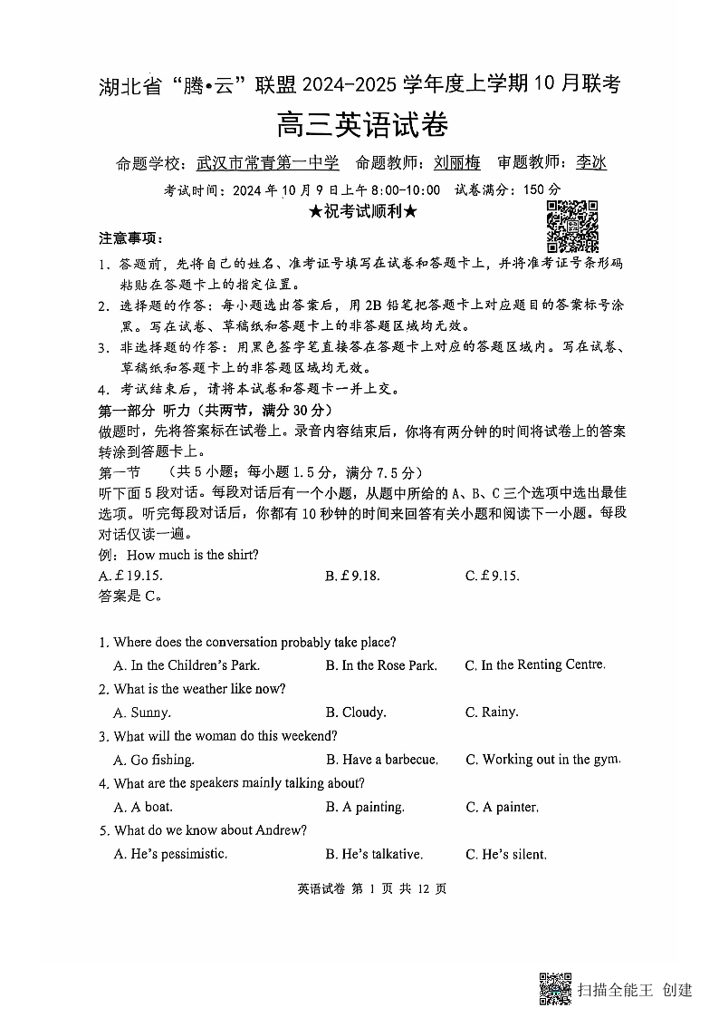 湖北省腾云联盟2024-2025学年度上学期10月联考英语试卷