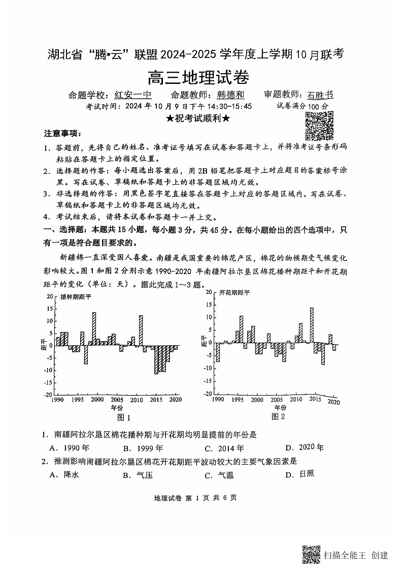 湖北省腾云联盟2024-2025学年度上学期10月联考地理试卷