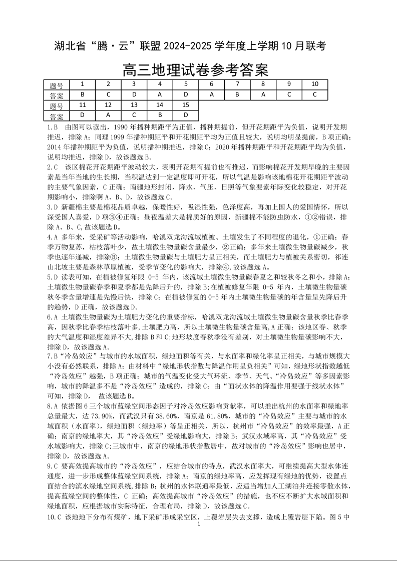 湖北省腾云联盟2024-2025学年度上学期10月联考地理答案