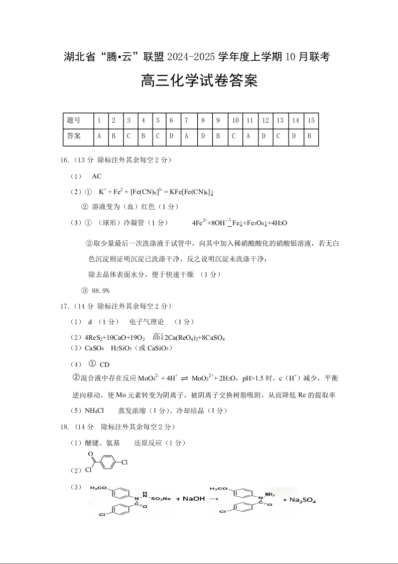 湖北省腾云联盟2024-2025学年度上学期10月联考化学答案