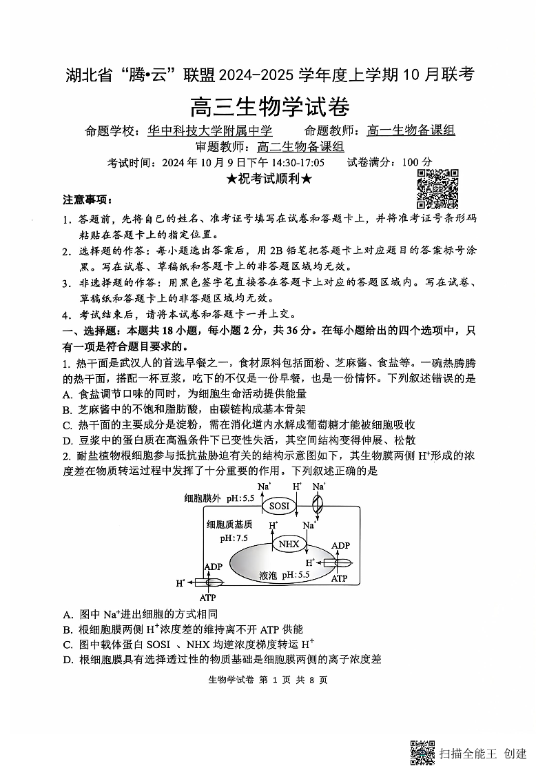湖北省腾云联盟2024-2025学年度上学期10月联考生物试卷
