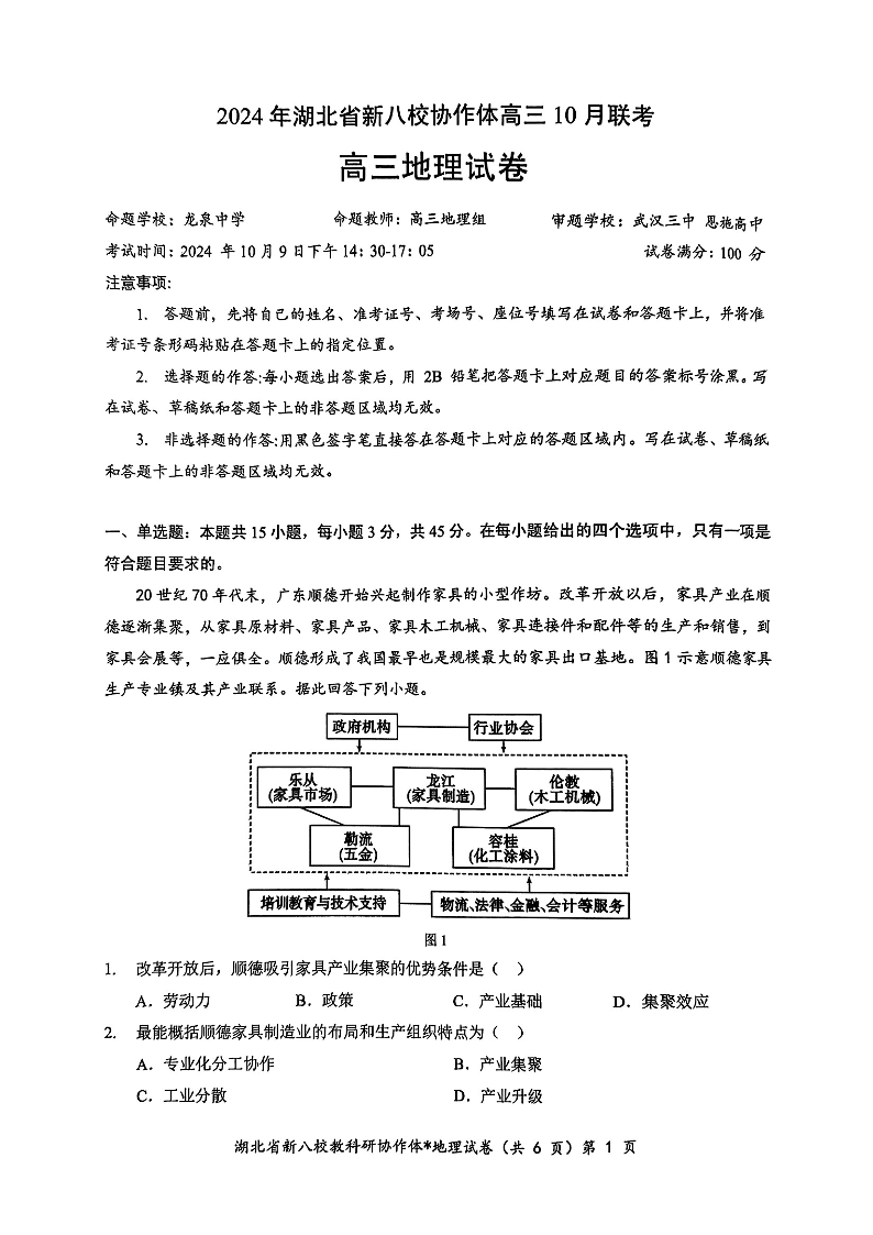 湖北省新八校协作体2025届高三10月联考地理试卷
