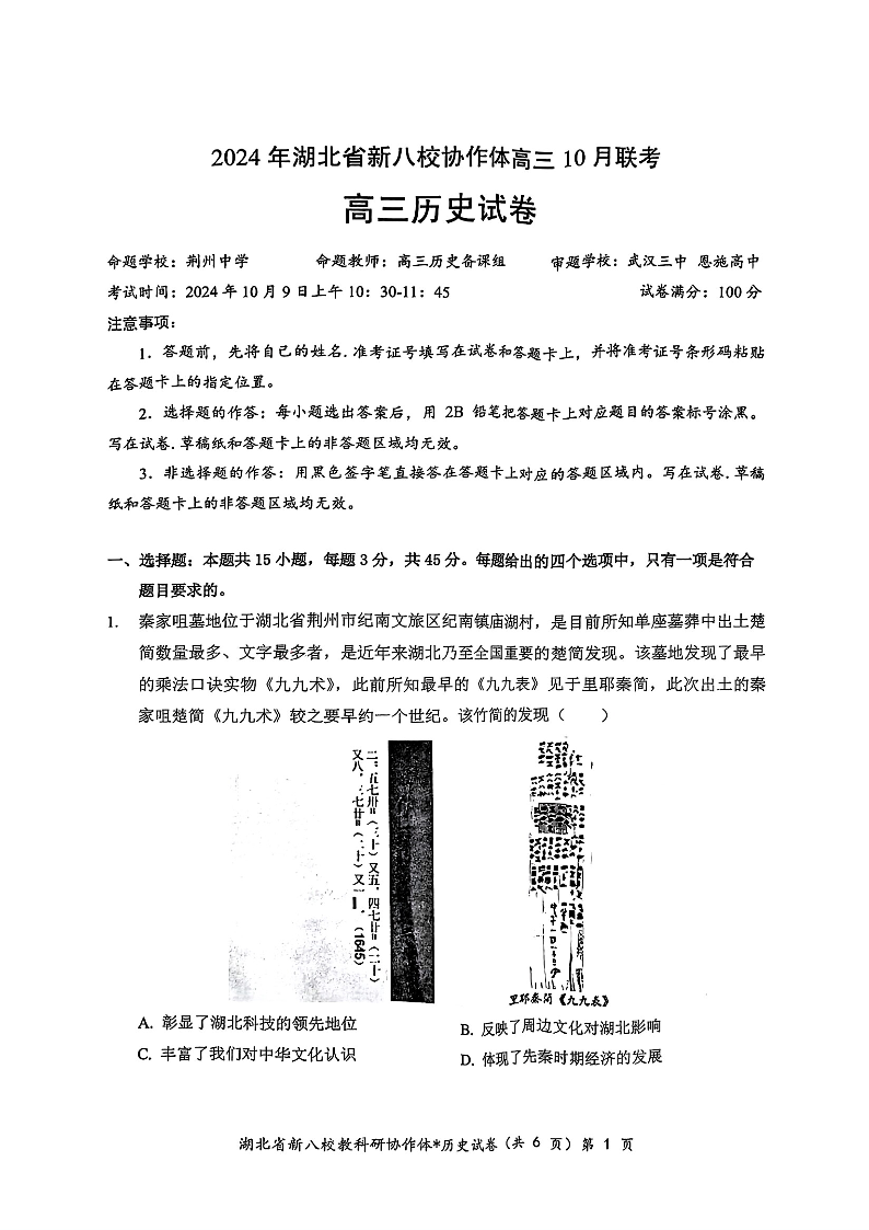 湖北省新八校协作体2025届高三10月联考历史试卷