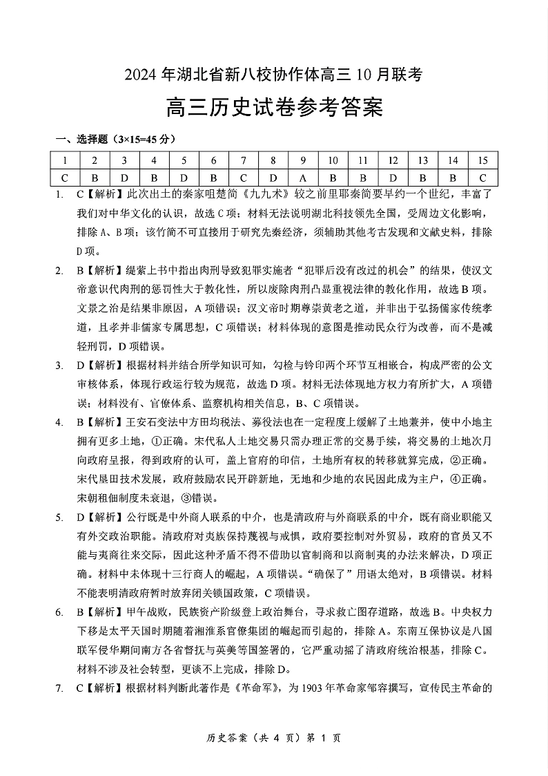 湖北省新八校协作体2025届高三10月联考历史答案