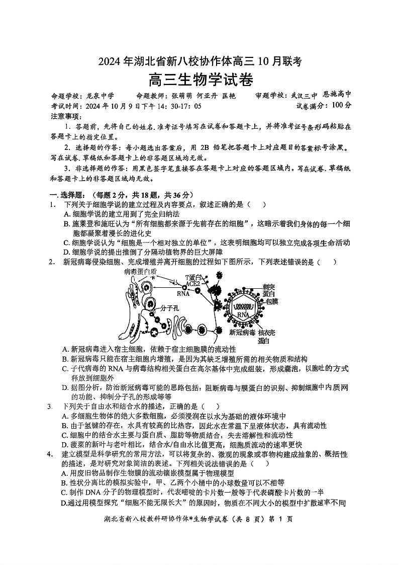 湖北省新八校协作体2025届高三10月联考生物试卷