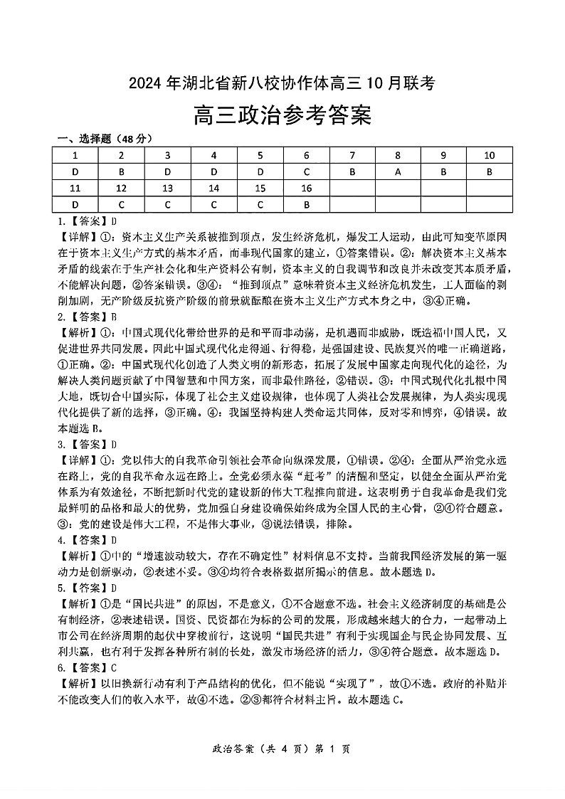 湖北省新八校协作体2025届高三10月联考政治答案