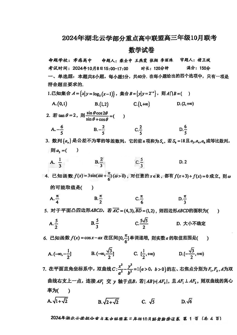 湖北云学部分重点高中联盟2025届高三年级10月联考数学试题