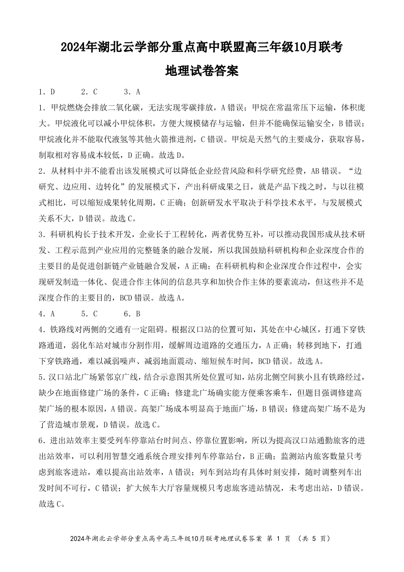 湖北云学部分重点高中联盟2025届高三年级10月联考地理答案