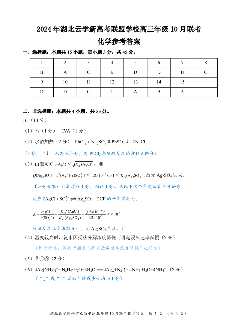 湖北云学部分重点高中联盟2025届高三年级10月联考化学答案