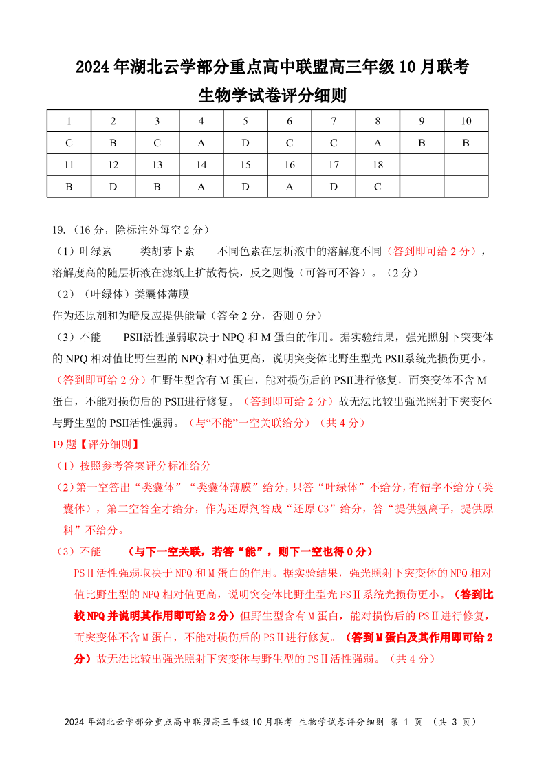 湖北云学部分重点高中联盟2025届高三年级10月联考生物答案