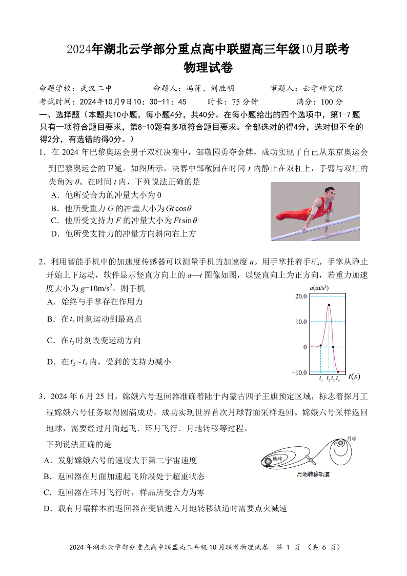 湖北云学部分重点高中联盟2025届高三年级10月联考物理试题