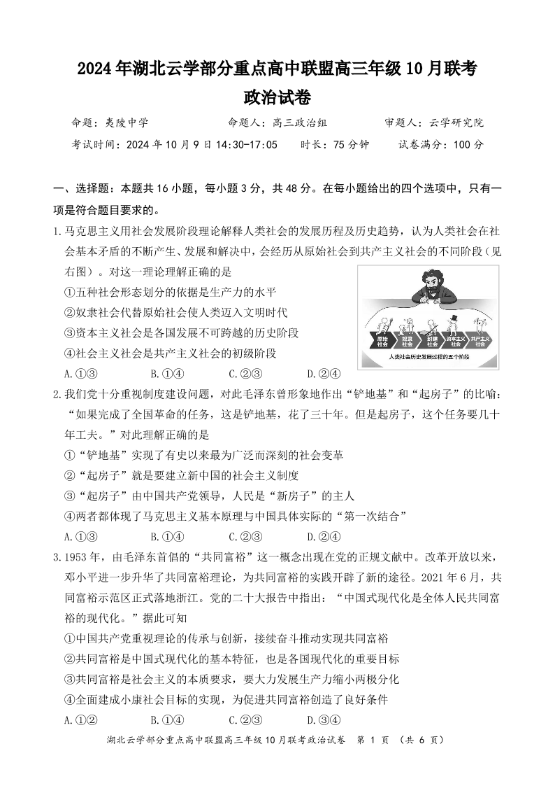 湖北云学部分重点高中联盟2025届高三年级10月联考政治试题