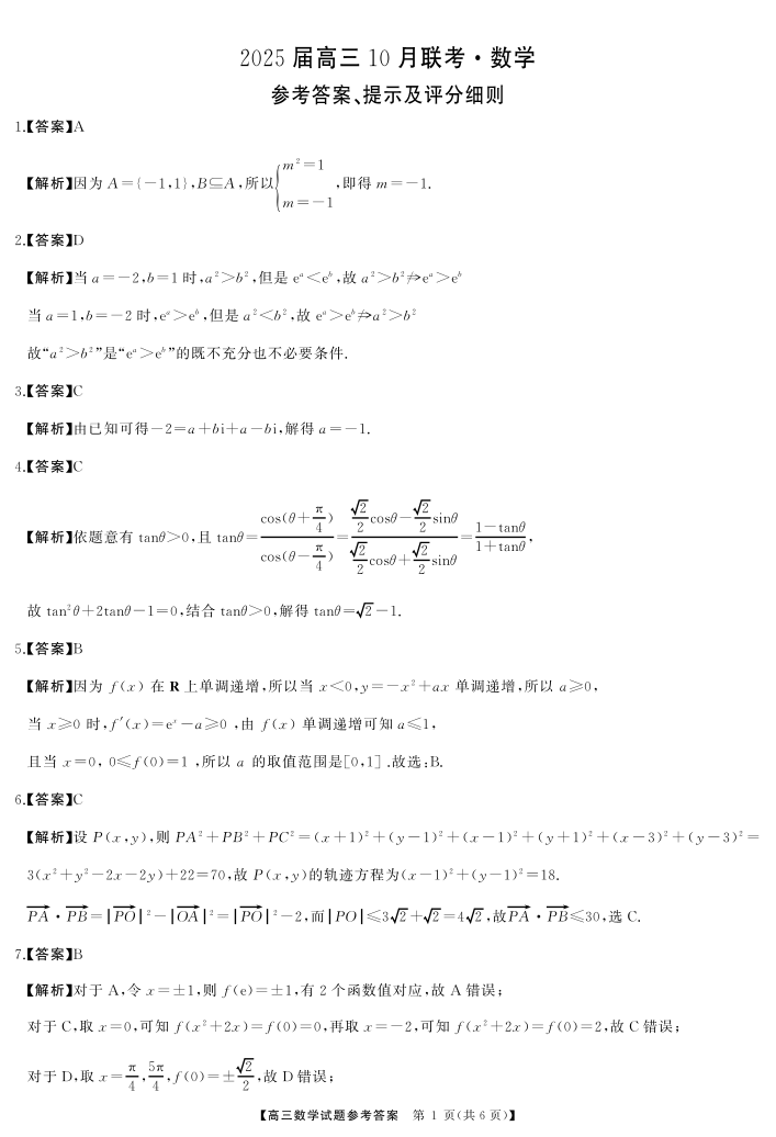 湖南省部分高中2025届高三10月联考数学答案