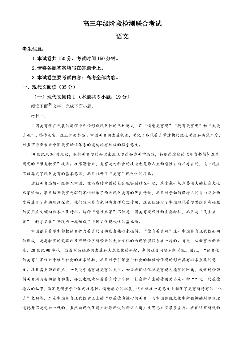 湖南省部分高中2025届高三上学期10月阶段检测联合考试语文+答案