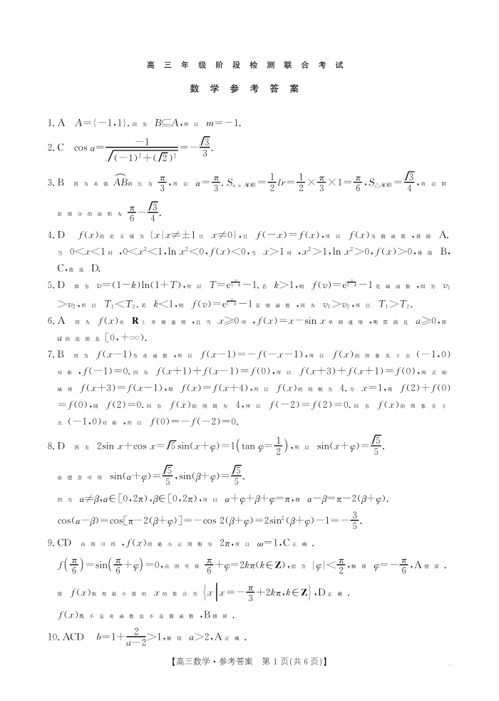 湖南省部分高中2025届高三年级阶段检测联合考试数学答案