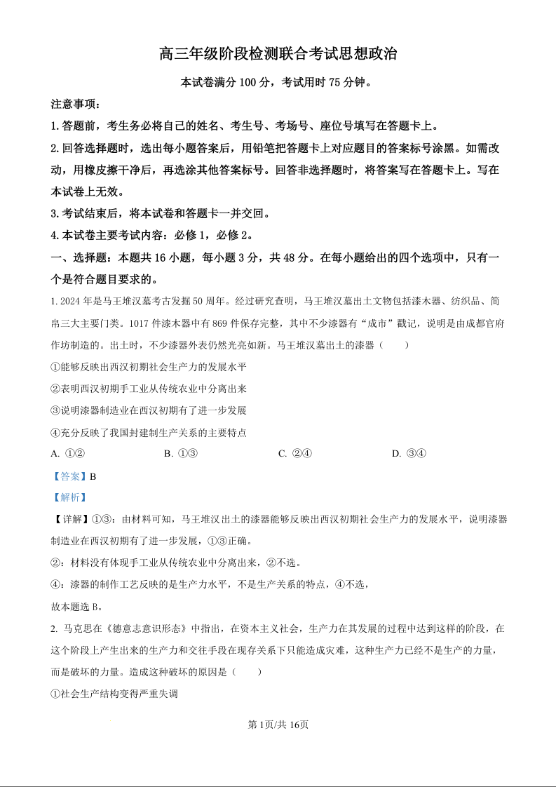 湖南省部分高中2025届高三年级阶段检测联合考试政治试题(解析版)