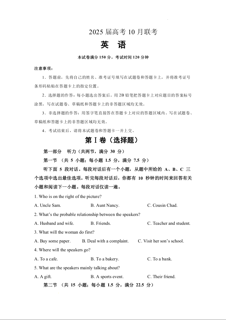 湖南省部分名校2025届高三上学期10月联考试题英语+答案