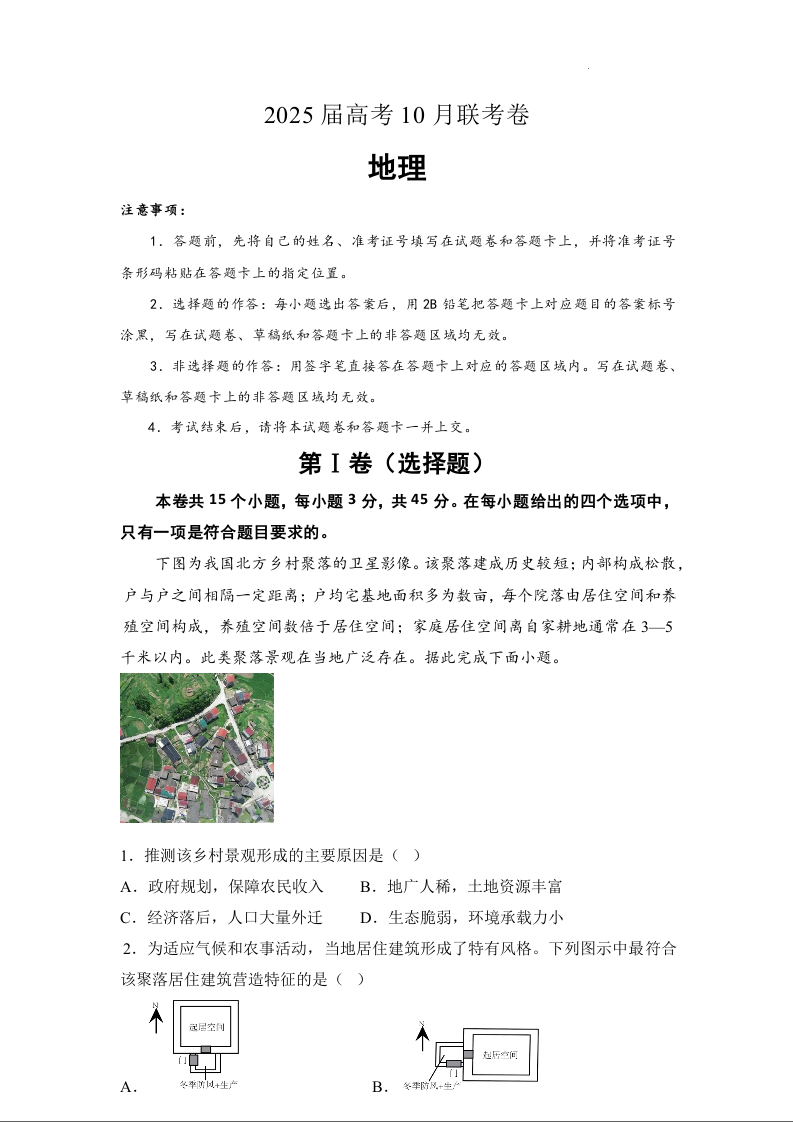 湖南省部分名校2025届高三上学期10月联考试题地理+答案