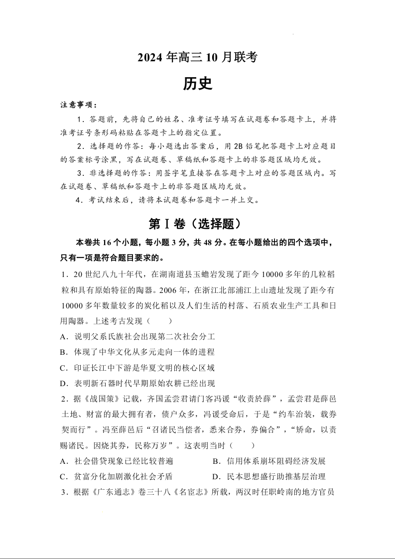 湖南省部分名校2025届高三上学期10月联考试题历史+答案