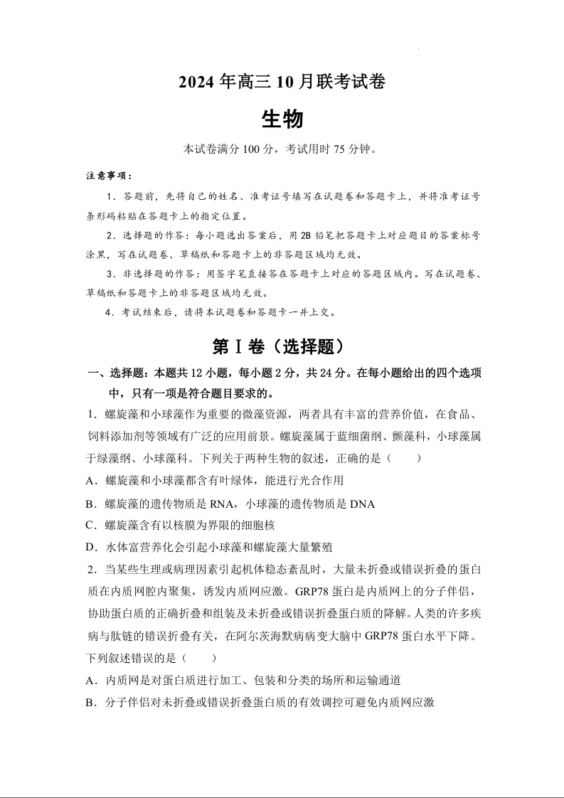 湖南省部分名校2025届高三上学期10月联考试题生物+答案
