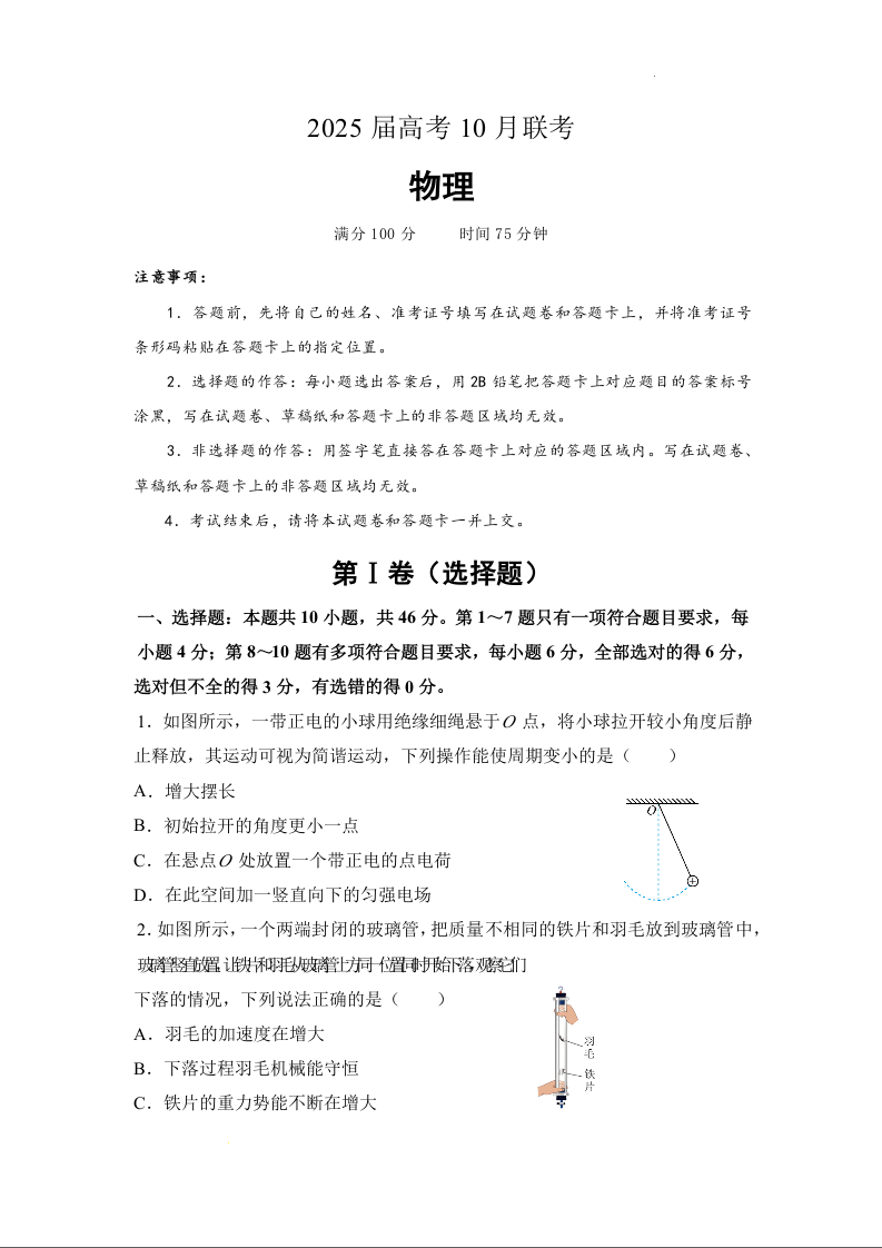 湖南省部分名校2025届高三上学期10月联考试题物理+答案