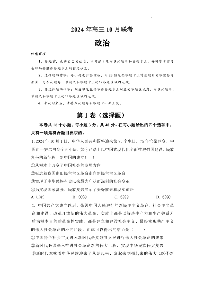 湖南省部分名校2025届高三上学期10月联考试题政治+答案