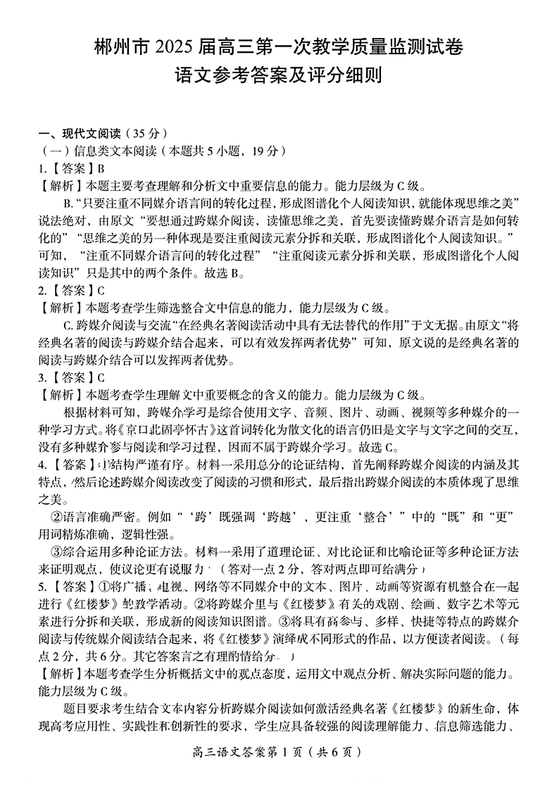 湖南省郴州市2025届高三第一次教学质量监测试卷语文答案