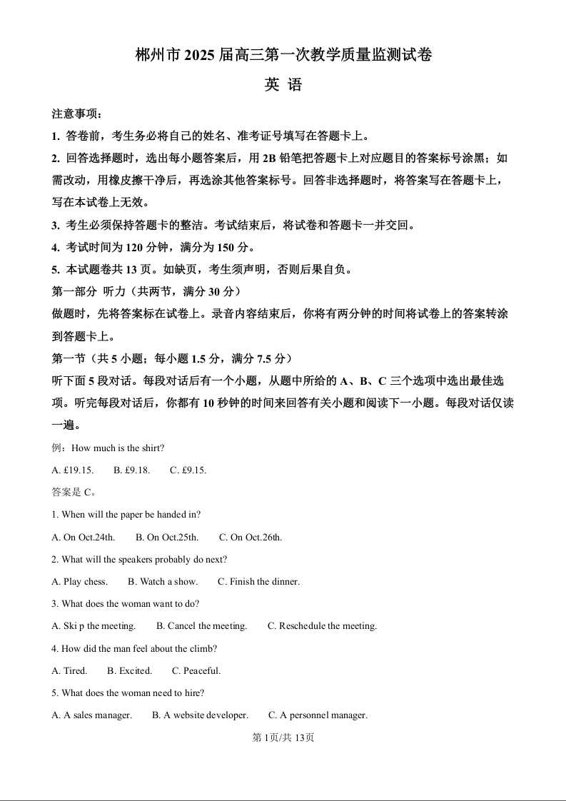 湖南省郴州市2025届高三第一次教学质量监测试卷(原卷版)