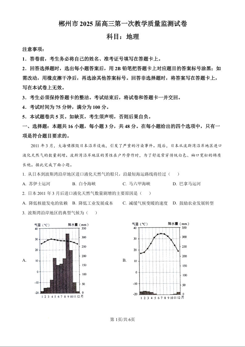 湖南省郴州市2025届高三第一次教学质量监测试卷(原卷版)