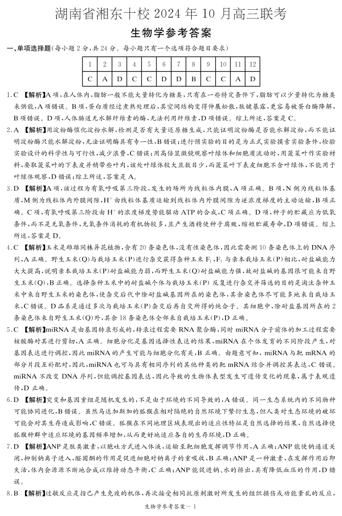 湖南省湘东十校2025届高三10月联考生物答案
