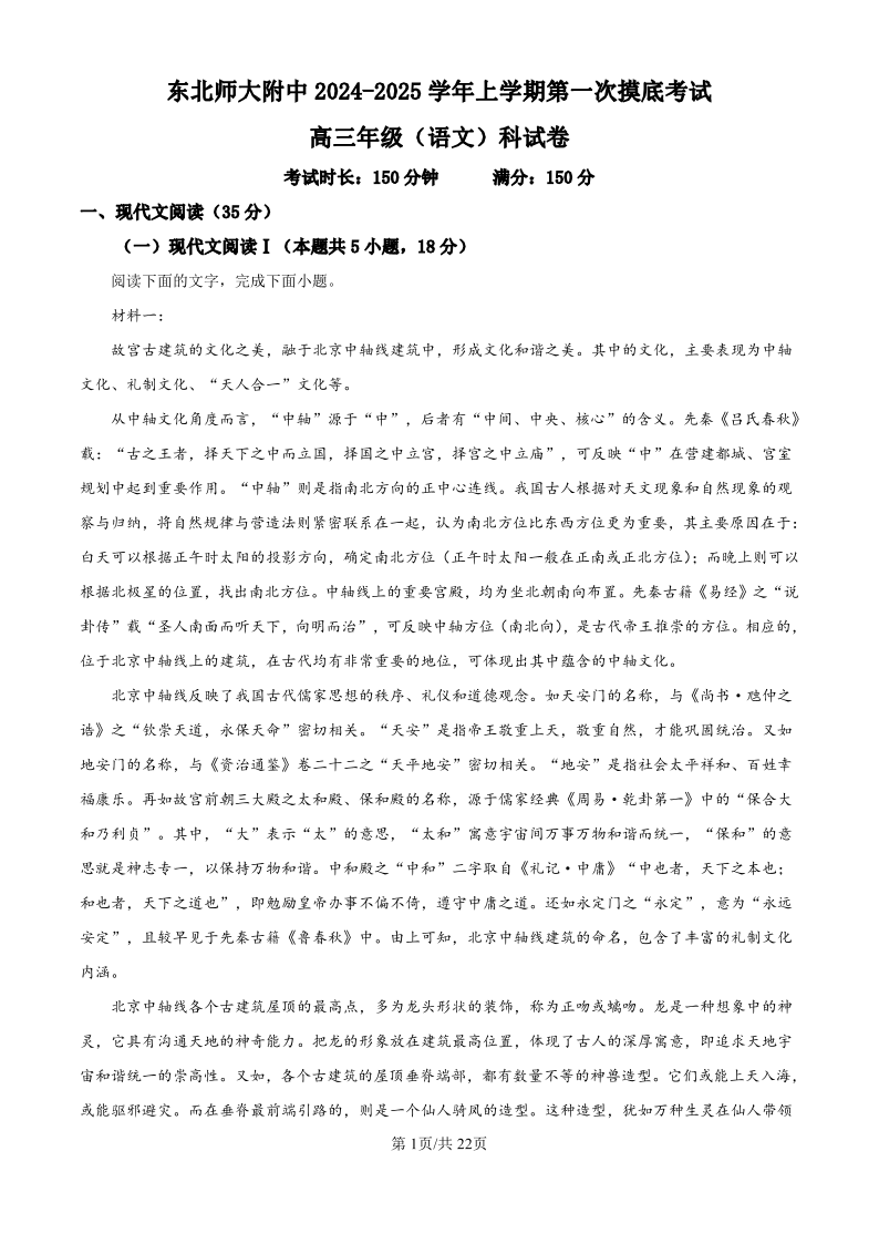 吉林省东北师范大学附属中学2024-2025学年高三上学期第一次摸底考试语文试卷(解析版)