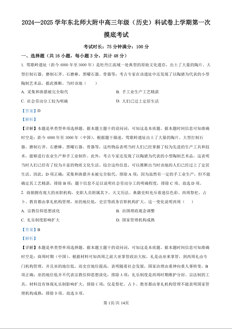 吉林省长春市东北师范大学附属中学2024-2025学年高三上学期第一次摸底考试历史试题(解析版)