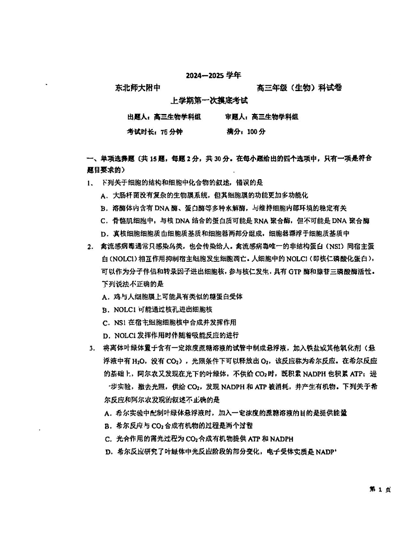 吉林省长春市东北师范大学附属中学2024-2025学年高三上学期第一次摸底考试生物+答案
