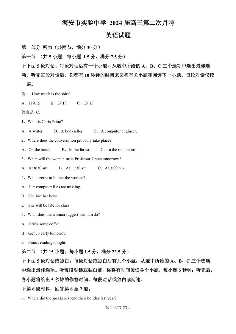 江苏省南通市海安市实验中学2025届高三年级第二次月考英语试卷(解析版)