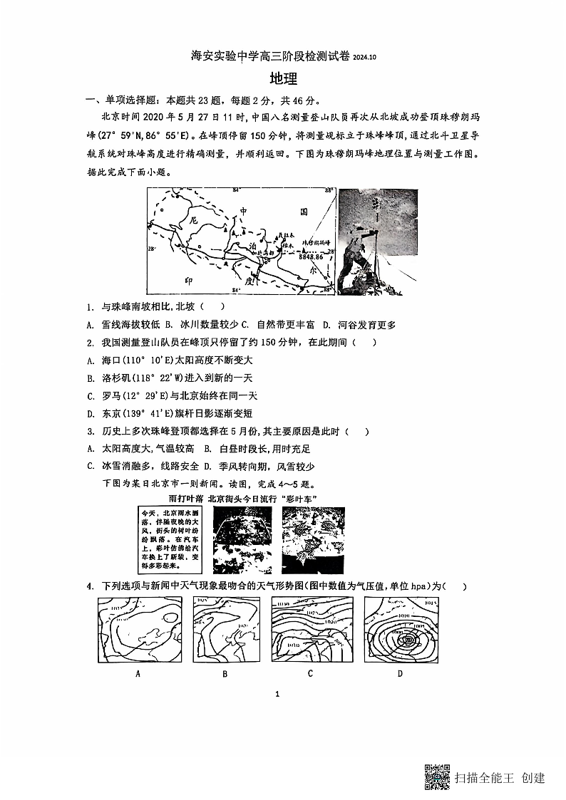 江苏省南通市海安市实验中学2025届高三年级第二次月考地理
