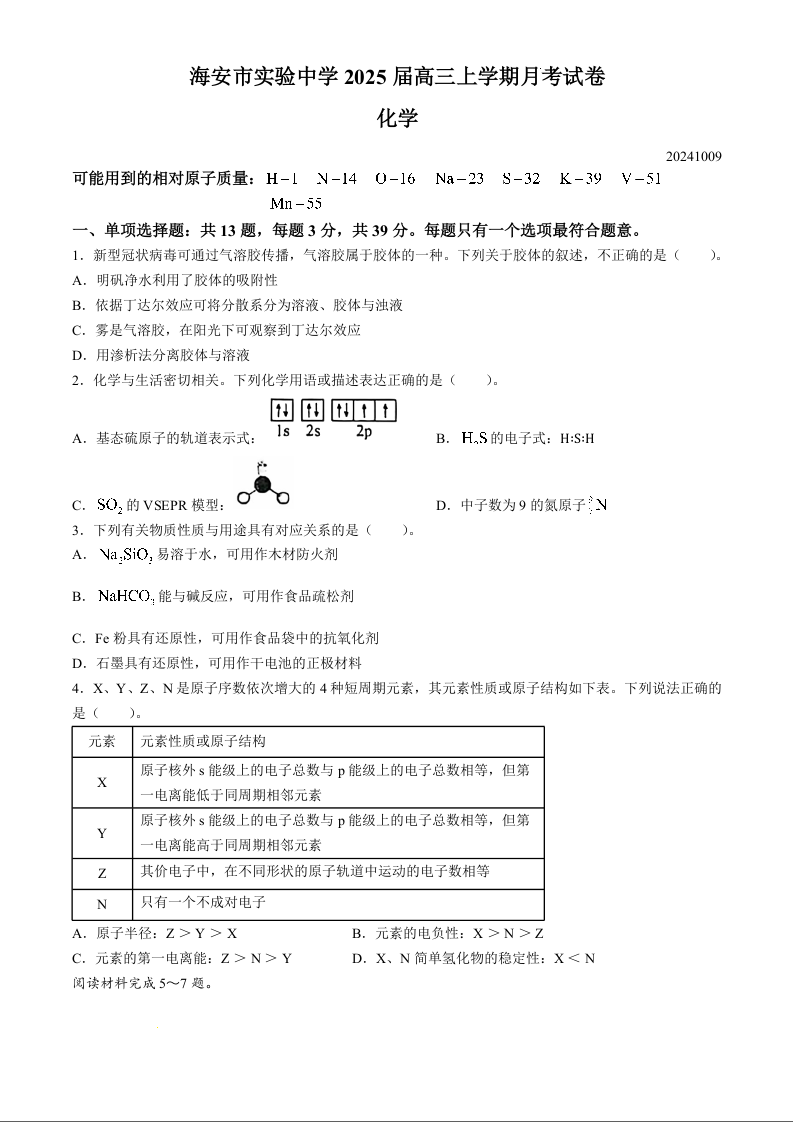 江苏省南通市海安市实验中学2025届高三年级第二次月考化学