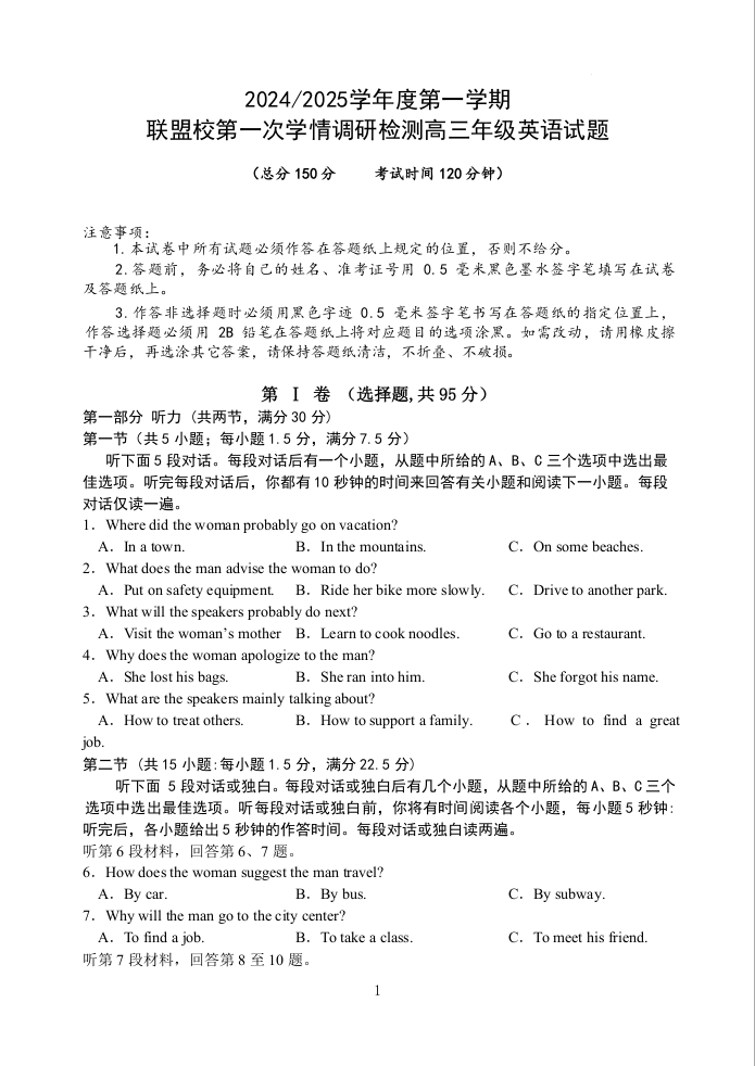 江苏省盐城市五校2024-2025学年度上学期第一次学情调研检测英语试题