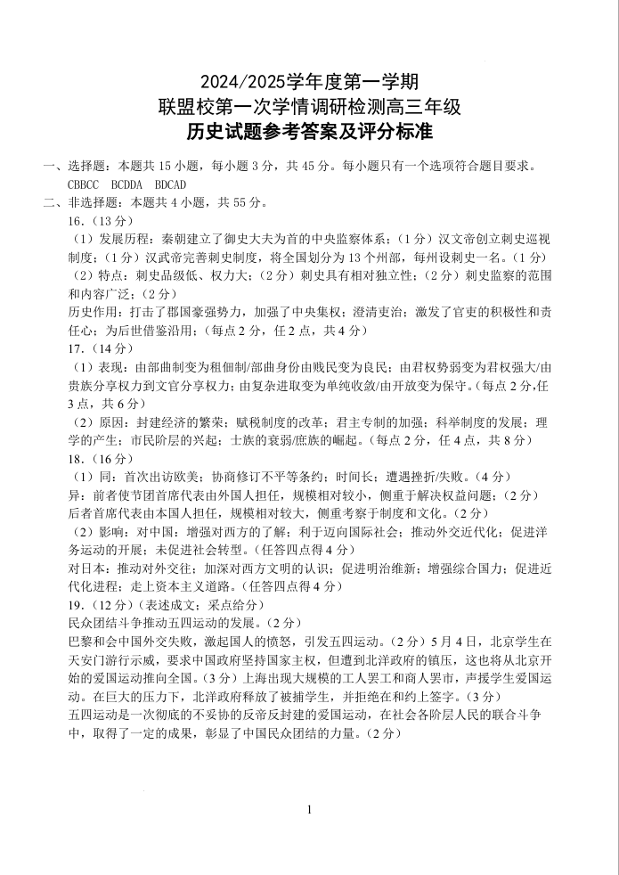 江苏省盐城市五校2024-2025学年度上学期第一次学情调研检测历史答案