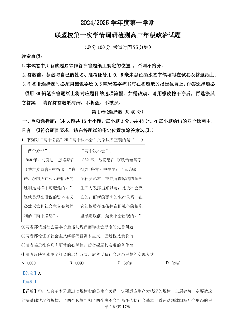 江苏省盐城市五校2024-2025学年度上学期第一次学情调研检测(解析版)