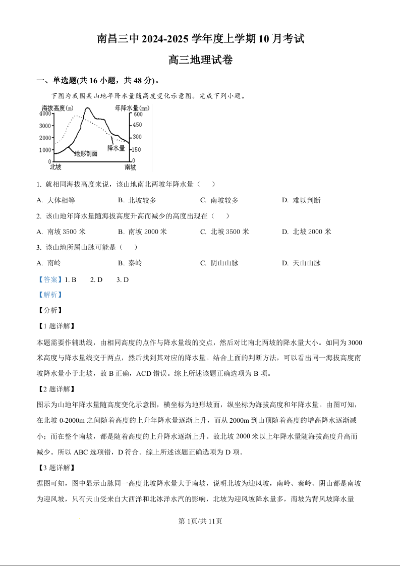 江西省南昌市第三中学2025届高三上学期10月月考地理试题(解析版)