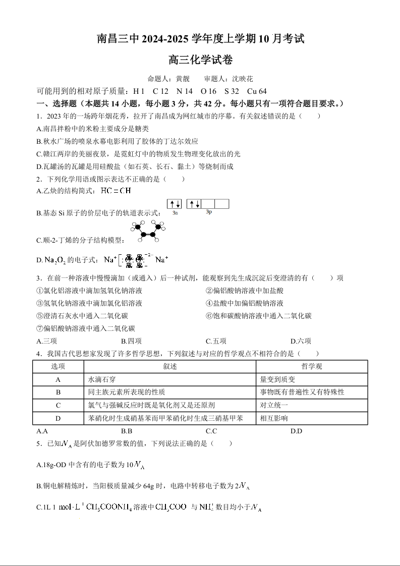 江西省南昌市第三中学2025届高三上学期10月月考化学+答案