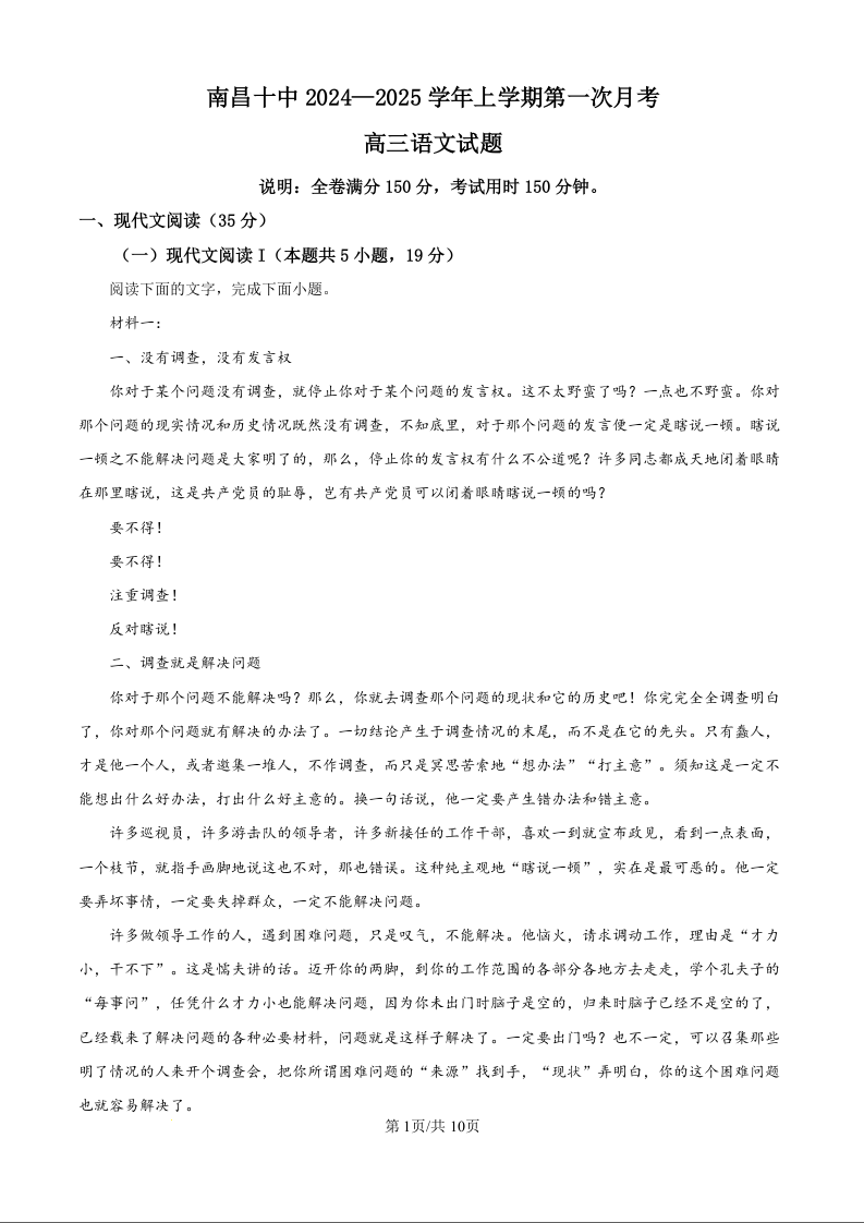 江西省南昌市第十中学2025届高三上学期第一次月考语文