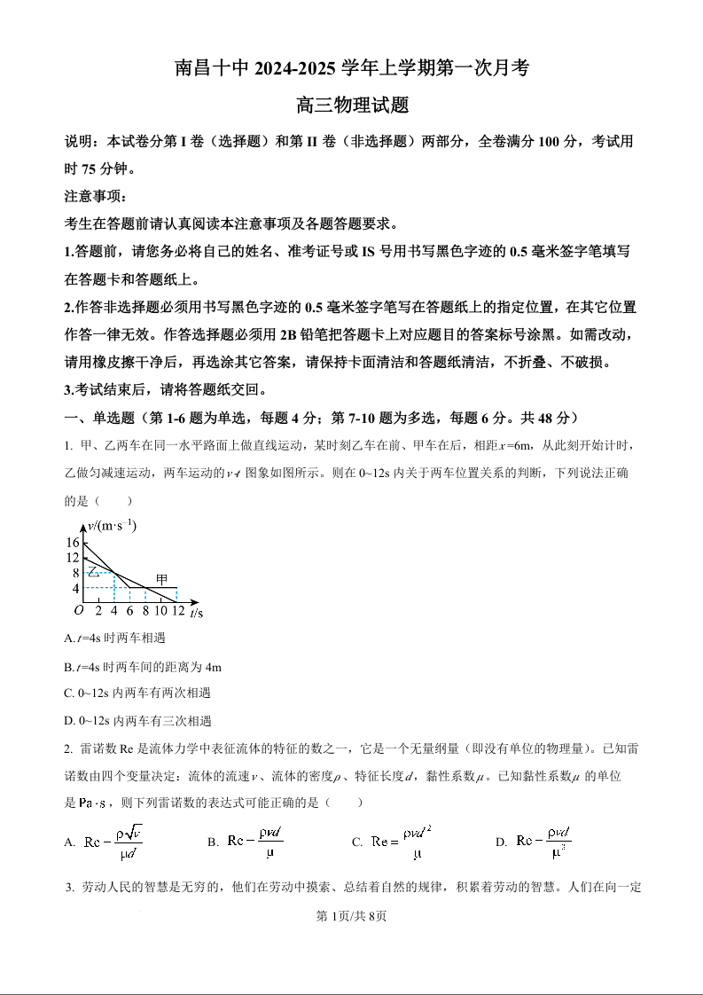 江西省南昌市第十中学2025届高三上学期第一次月考物理