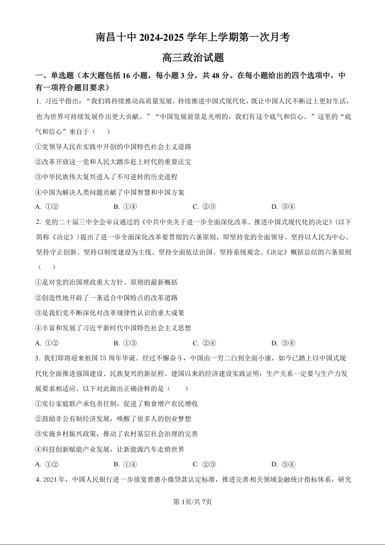 江西省南昌市第十中学2025届高三上学期第一次月考政治