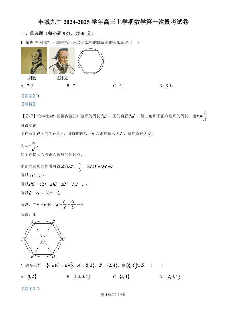 江西省宜春市丰城市第九中学2024-2025学年高三上学期第一次段考数学答案