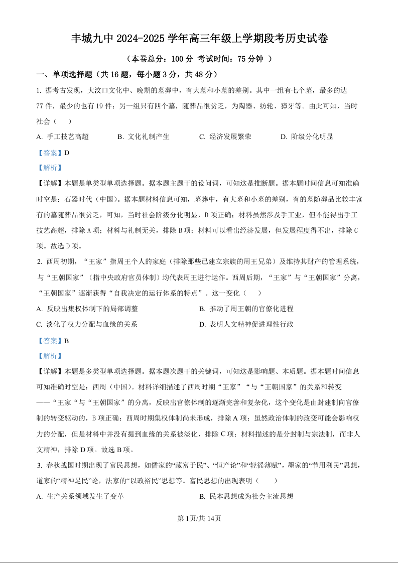 江西省宜春市丰城市第九中学2024-2025学年高三上学期第一次段考历史答案