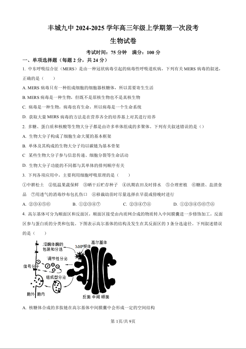 江西省宜春市丰城市第九中学2024-2025学年高三上学期第一次段考生物