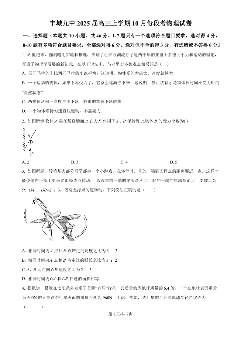 江西省宜春市丰城市第九中学2024-2025学年高三上学期第一次段考物理(原卷版)