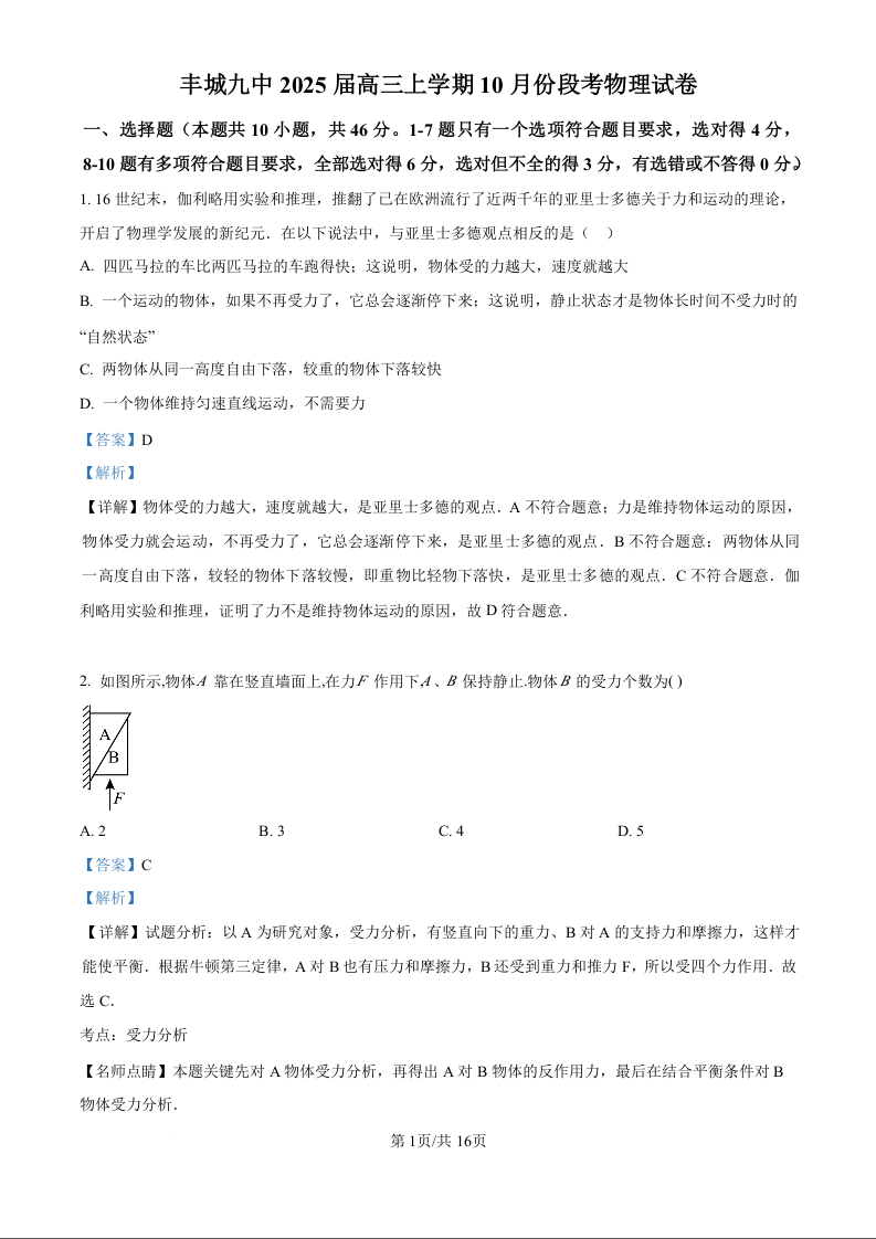 江西省宜春市丰城市第九中学2024-2025学年高三上学期第一次段考物理(解析版)