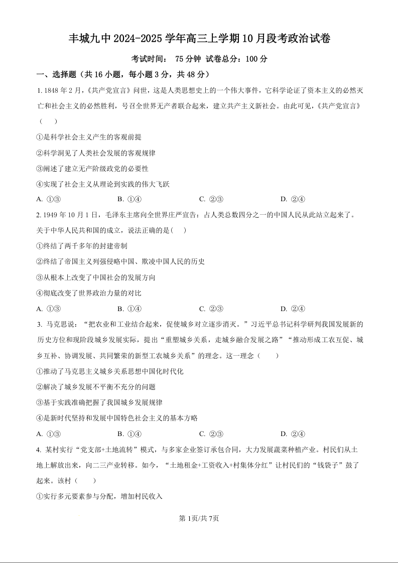 江西省宜春市丰城市第九中学2024-2025学年高三上学期第一次段考政治